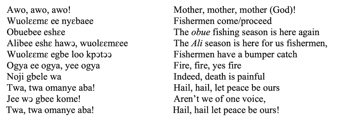 Arguably, Crenstil may have dispensed with the overture because some of the key songs and themes it hints at, like the asafo songs, are performed in full later in the film opera. What betrays his well-intended stance however is the complete omission of the Awo, Awo kple chant from the entire film adaptation. As noted earlier, the chant is the foremost kple ritual prayer among Aquaye’s Ga people performed during all ritual occasions, particularly the kind implied in The Lost Fishermen story that involves indigenous values, deities and taboos. The fact that Acquaye used the chant not just in the opening lines of the overture but on two other occasions in the first scene alone demonstrates its centrality to The Lost Fishermen story. Below is the text in the Ga language48 with the English translation49.