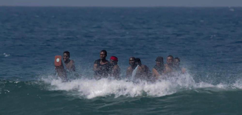 Figure 2. Screenshot from Kwame Crenstil's adaptation of The Lost Fishermen (2023) showing actors/fishermen in the throes of violent sea waves in situ.